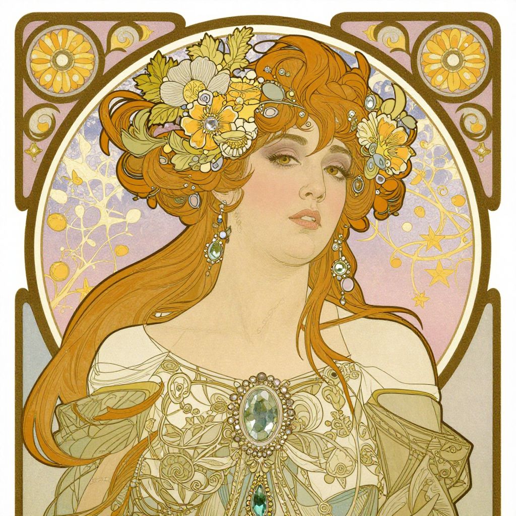 Garbie in an art nouveau inspired portrait, flowing hair adorned with flowers and jewels, elegant patterns framing the image, soft pastel tones with intricate line work, reminiscent of classic illustrated posters from the early 20th century.
