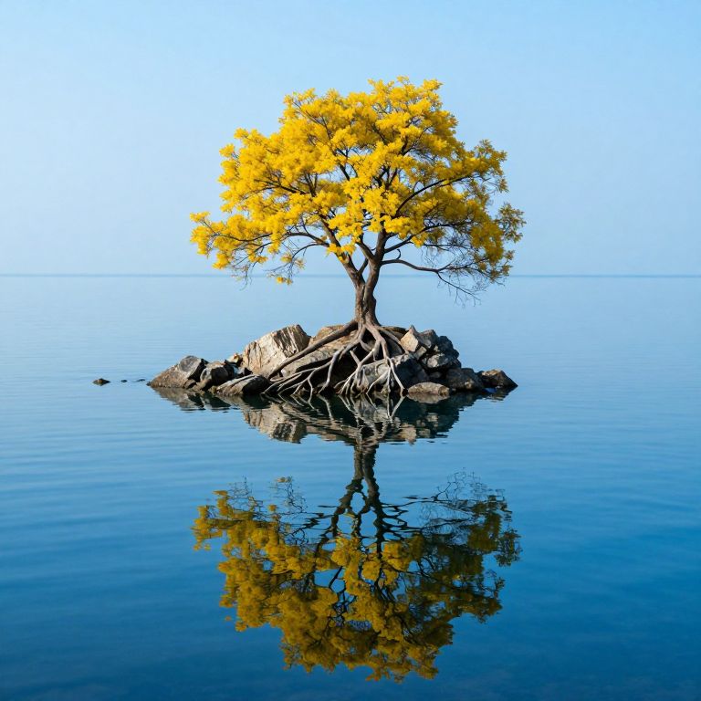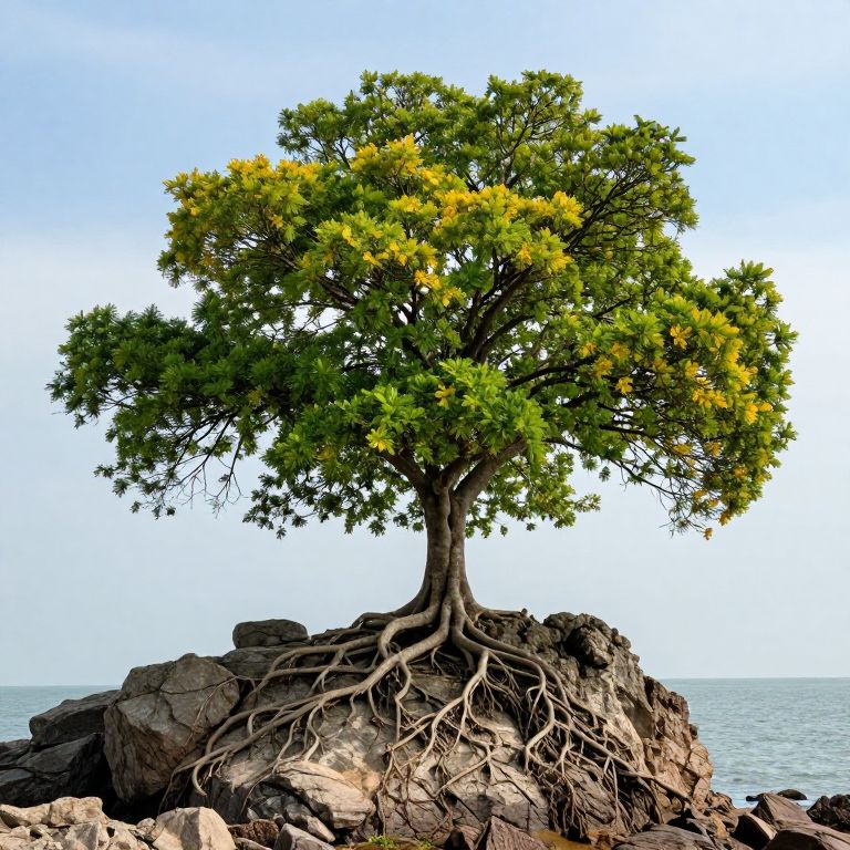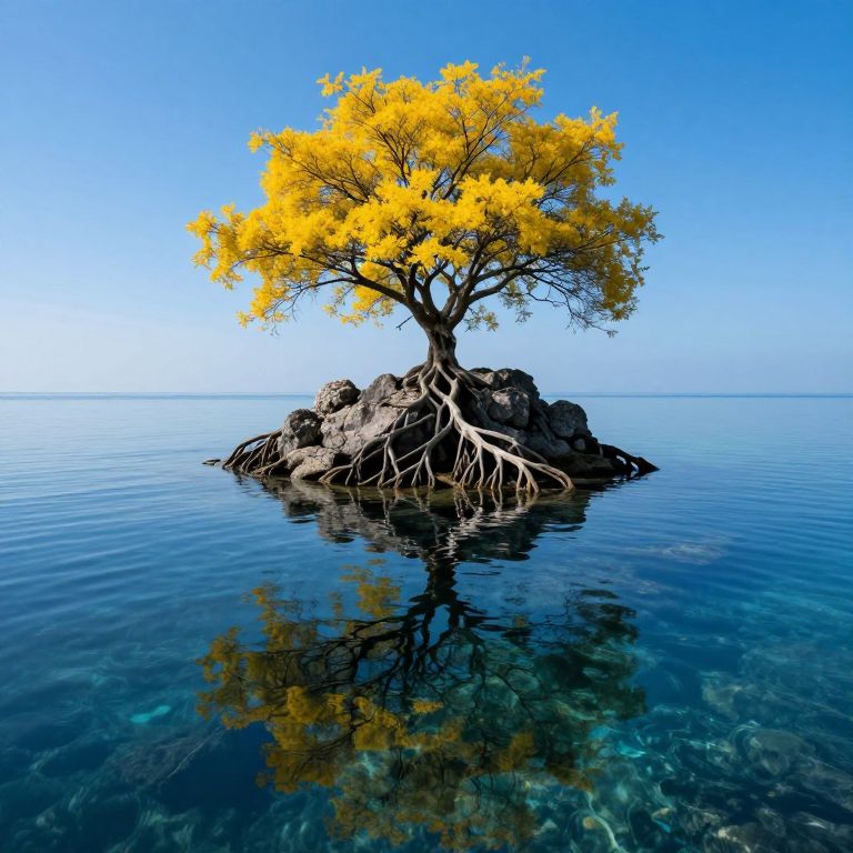 A solitary tree stands resiliently atop a rocky outcrop in the middle of a vast ocean, its lush green canopy contrasting sharply against the cloudy sky above, while its intricate network of roots extends deeply into the dark, serene waters below.
