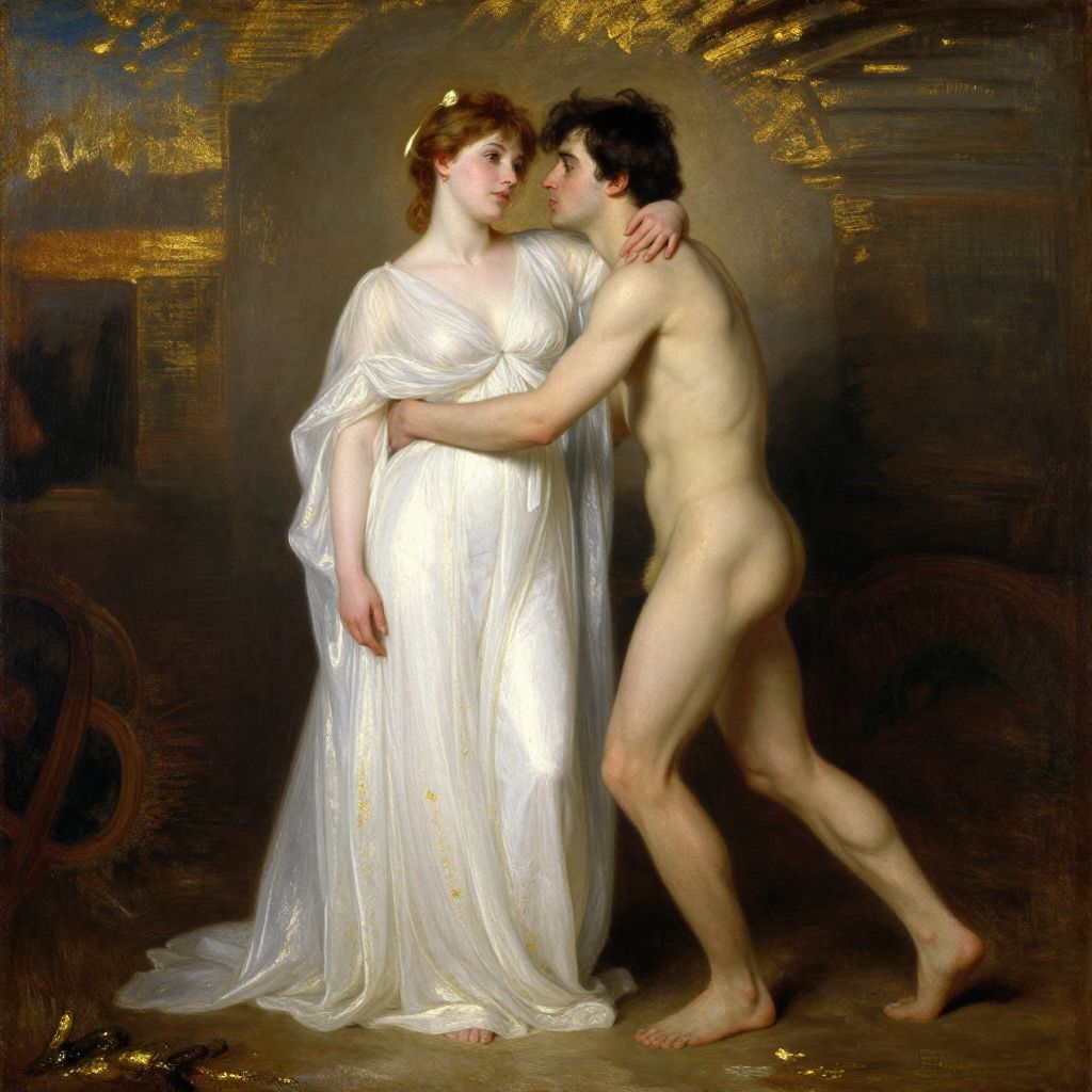 Neoclassical painting of a nude, muscular man embracing a fair-skinned woman in a white, draped gown, gazing intimately. Dark,