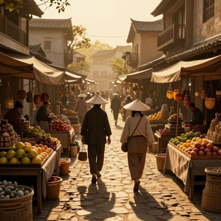 An atmospheric 3D-rendered depiction of a traditional marketplace bathed in golden-hour lighting, where shadowy figures clad in conical hats traverse cobblestone streets lined with stalls offering vibrant fruits and artisanal goods, evoking a timeless, vintage ambiance.