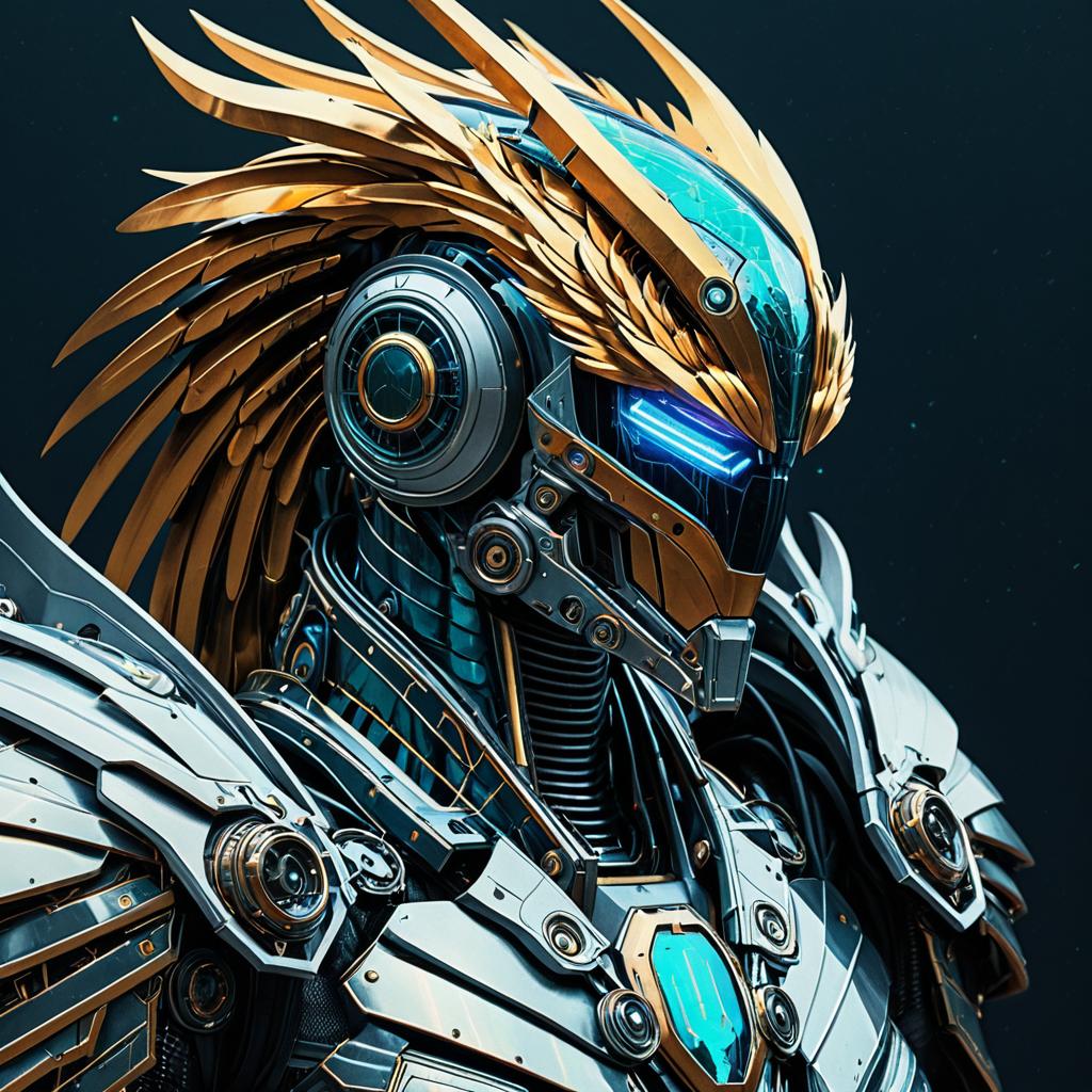 Detailed portrait of a high-tech mechanical phoenix warrior featuring avant-garde futuristic armor with iridescent metallic tones. The design showcases intricate cyber-surrealism elements and hyper-realistic rendering, combining gold and silver metallic components with glowing blue accents. The helmet incorporates a phoenix motif with stylized metallic feathers and a blue visor, creating a bold and striking futuristic aesthetic.