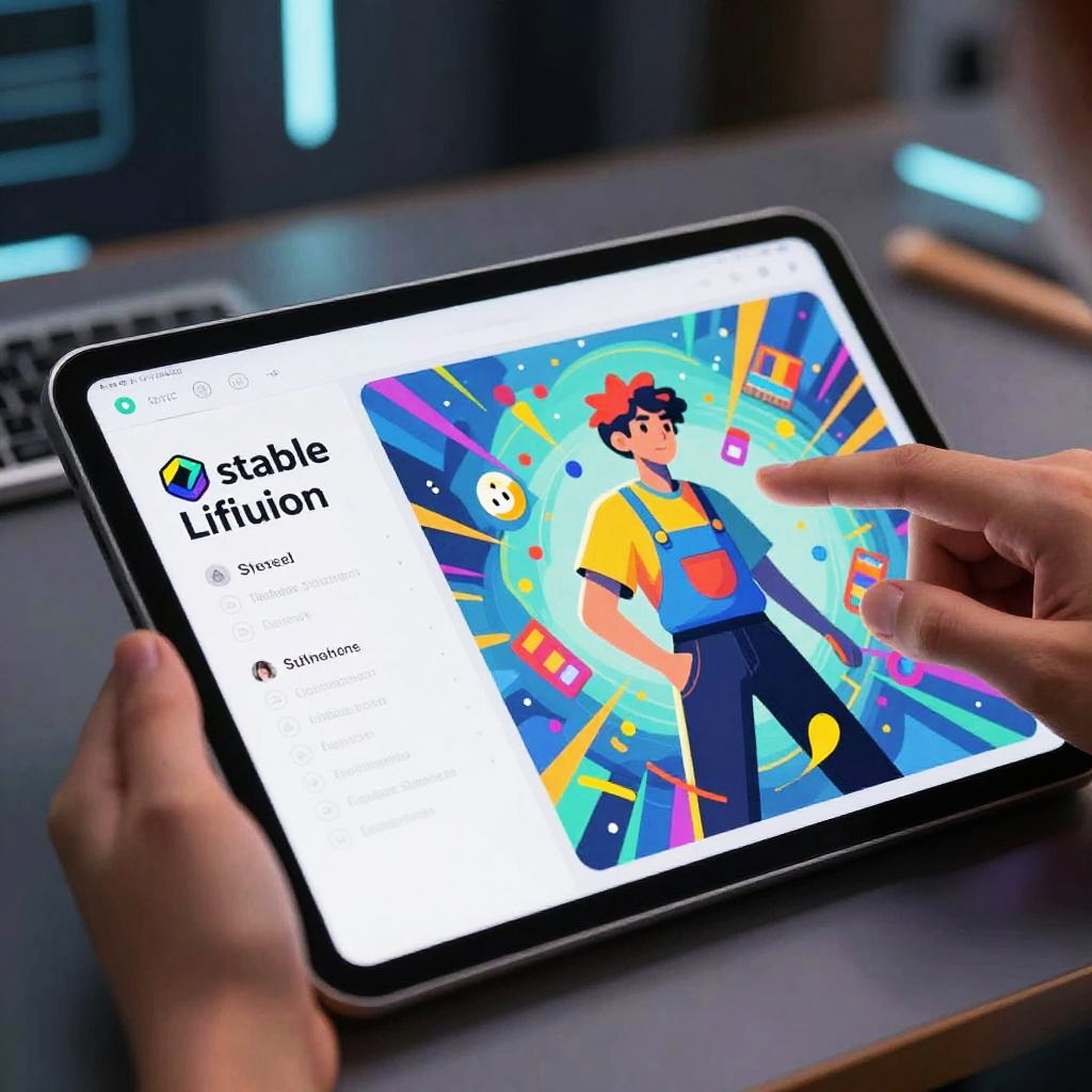 How to use stable diffusion locally explained, hands interacting with digital tablet, AI-generated artwork appearing, high-tech environment, colorful and dynamic visual elements