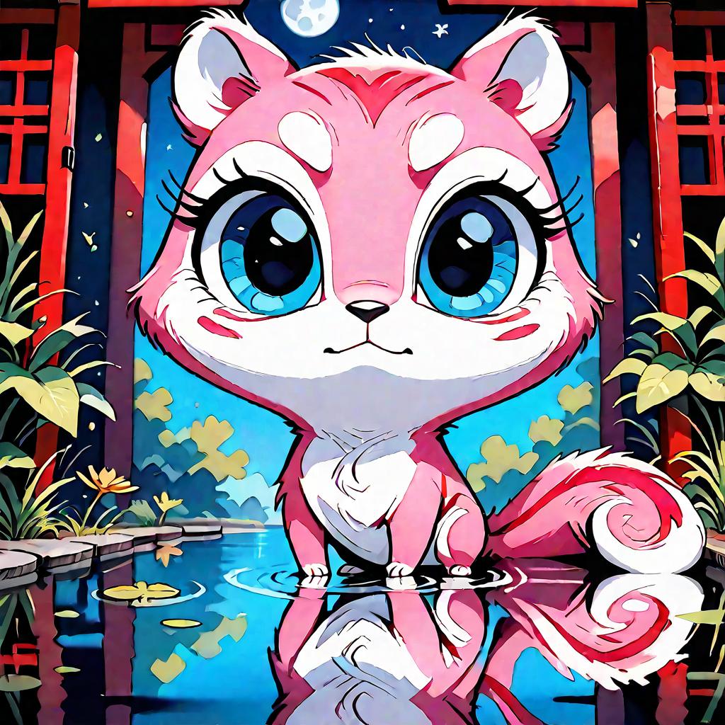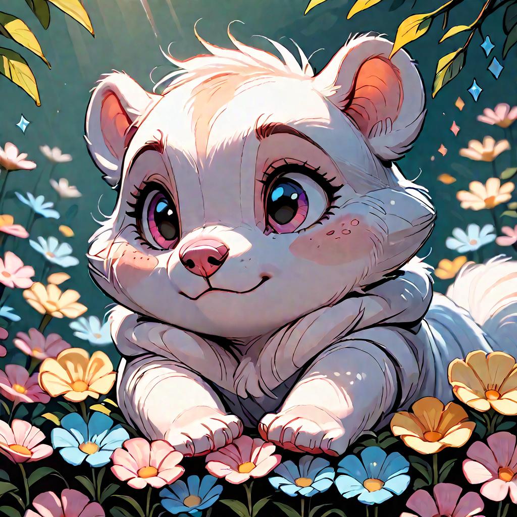 Score_9, score_8_up, score_7_up, score_6_up, score_5_up, score_4_up, animal_focus, whimsical, soft_focus, creamy_white, skunk_like, plush_fur, peaceful, meadow, wildflowers, dew, sunbeams, dappled_glow, cute, snuggly, adorable, serene