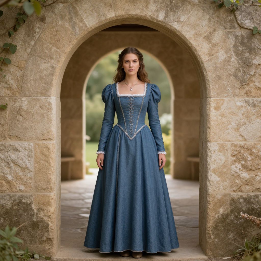 Photograph of a young woman standing in a stone archway. She has wavy brown hair and fair skin, wearing a long-sleeved, blue, medieval-style dress with puffed shoulders and a fitted bodice adorned with white lace and pearl details. The dress has a full, flowing skirt. The stone archway has a textured, beige surface with greenery partially visible in the background. The image has a soft, natural light, highlighting the woman's serene expression and the detailed texture of her dress and the stone archway. The setting suggests an outdoor, historical or fantasy-themed location.