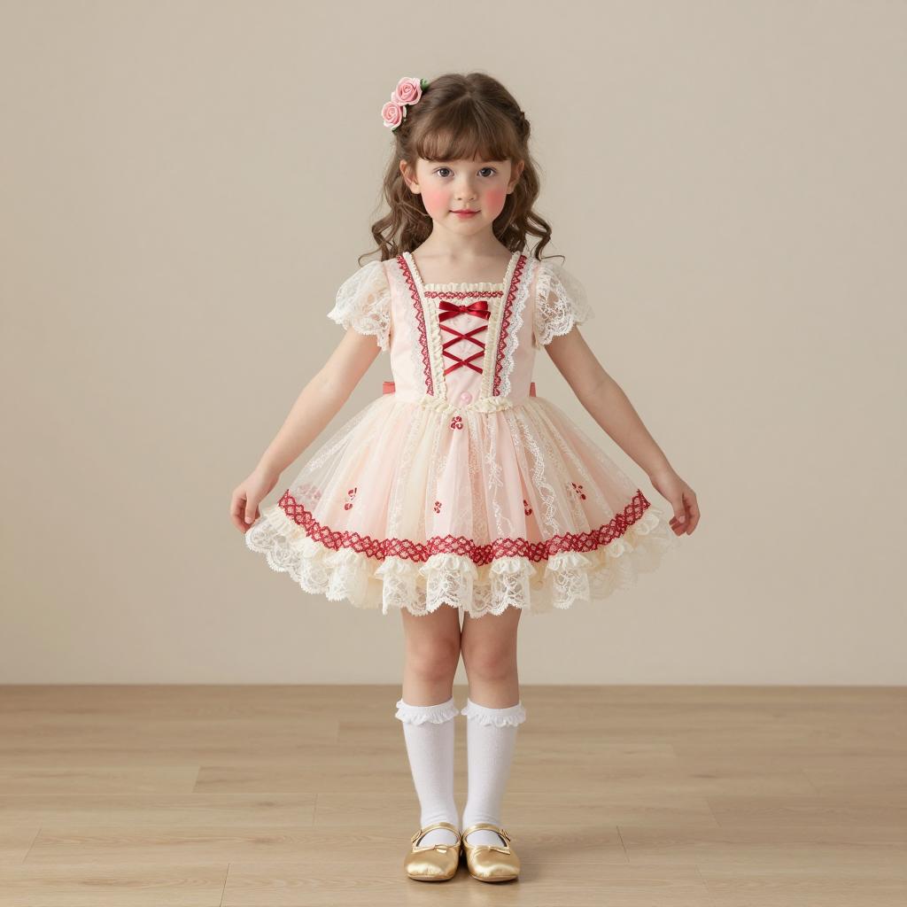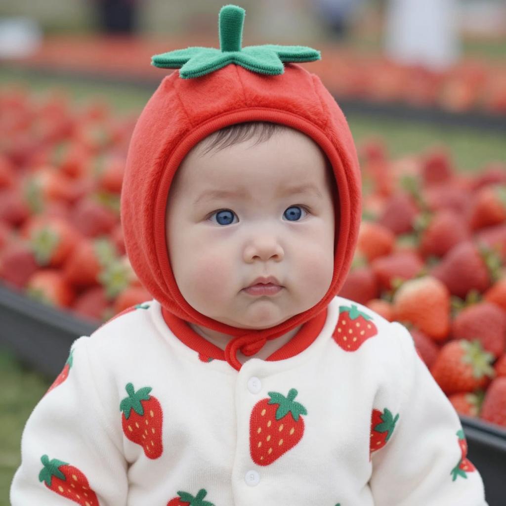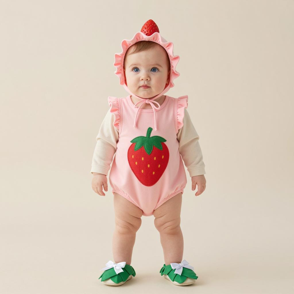 Toddler strawberry shortcake, photograph of a cute little girl standing in a bright room, wearing a red strawberry-themed dress with white polka dots and puffy sleeves, white lace trim, green bow tie, red shoes with white bows, white knee socks, strawberry hair accessory, background with blurred hanging strawberries and potted plants, sunlight filtering through, warm colors, soft focus, realistic, child, dress, strawberry, cute, bright, detailed, cheerful