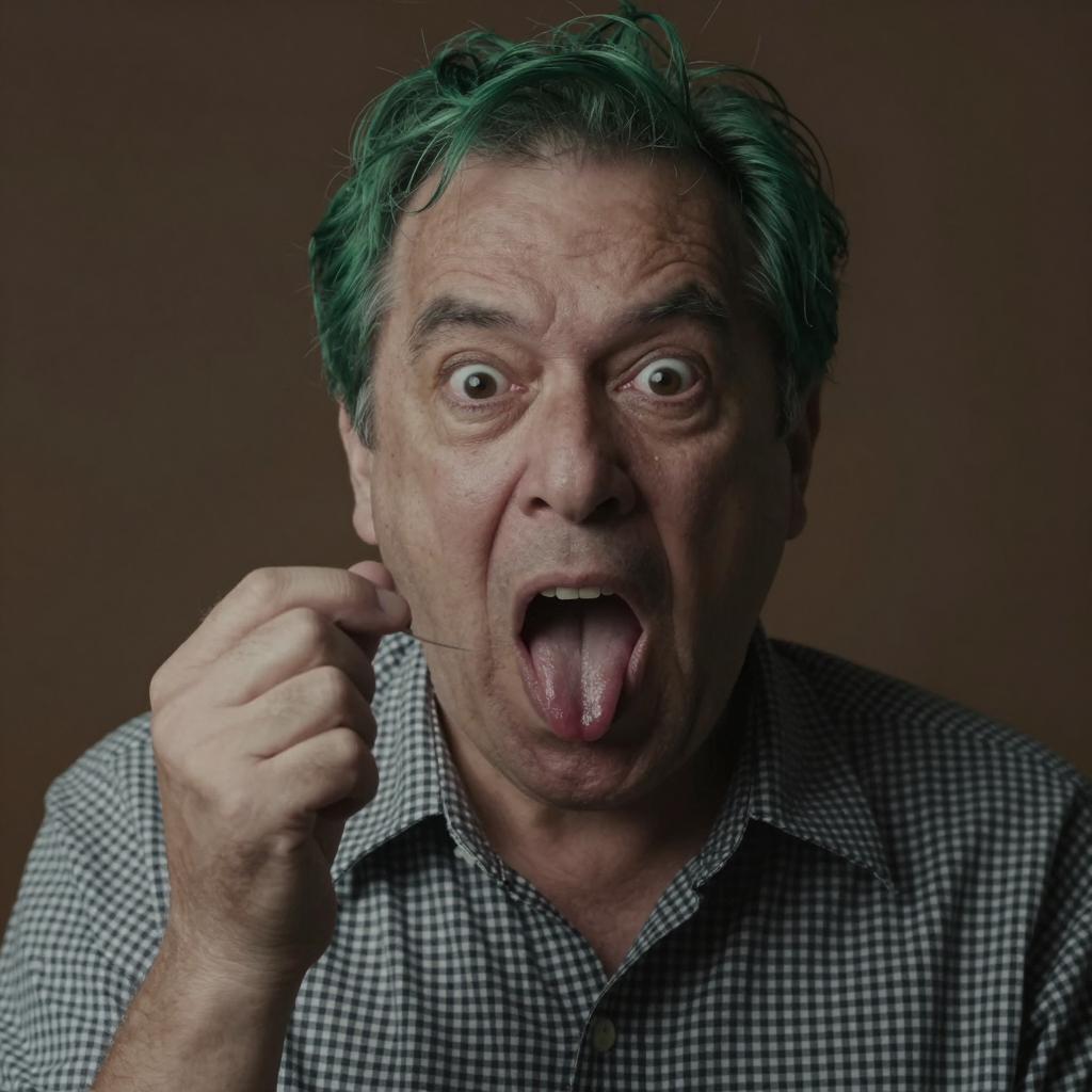 Middle-aged man with green hair, dark eyes, and exaggerated facial expression, mouth wide open, tongue visible, holding a string with a small object. Wearing a checkered shirt, dimly lit, brown background, close-up shot. Intense, dramatic pose.