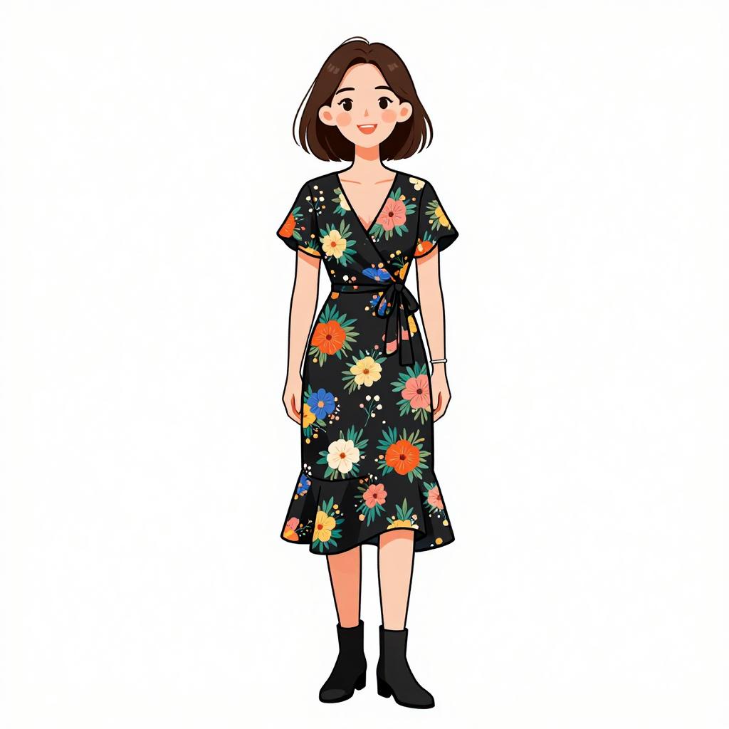 Woman with pretty face and pretty hair. smiling Woman, playful charm, black mini dress with red floral pattern, short puff sleeves, crew neckline, fitted waist with subtle belt, flared skirt, leopard print loafers, white background. --sref 1467