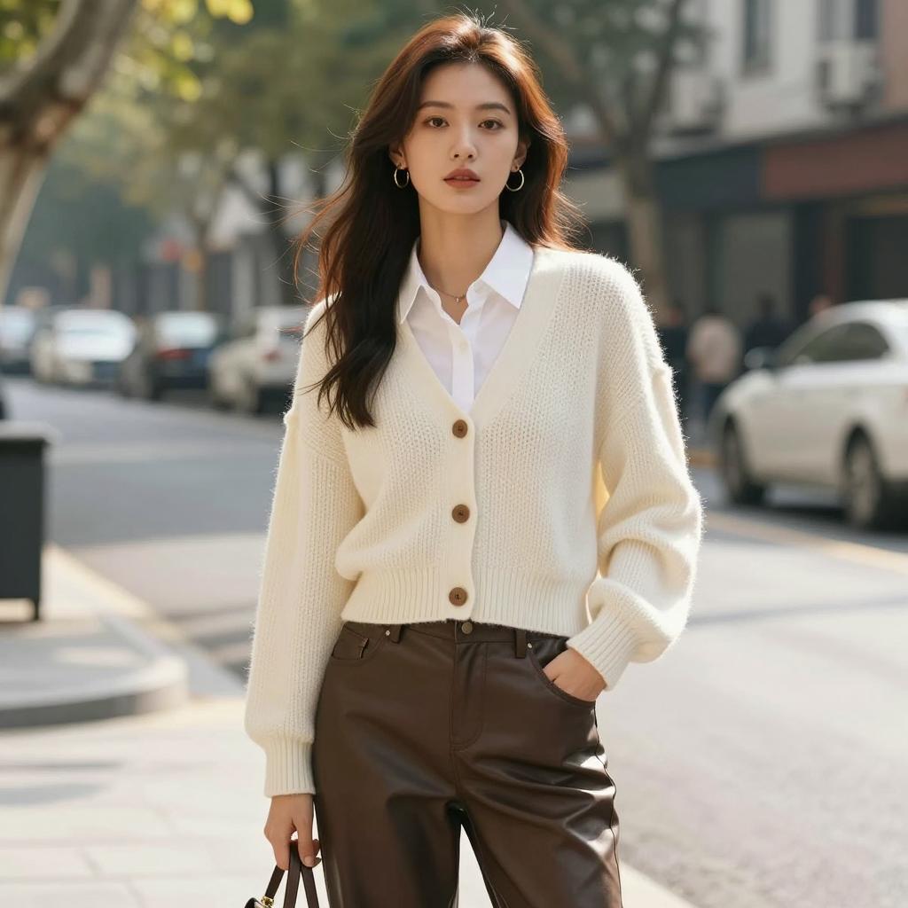 Asian Woman in Soft Cashmere Sweater and Tailored Trousers