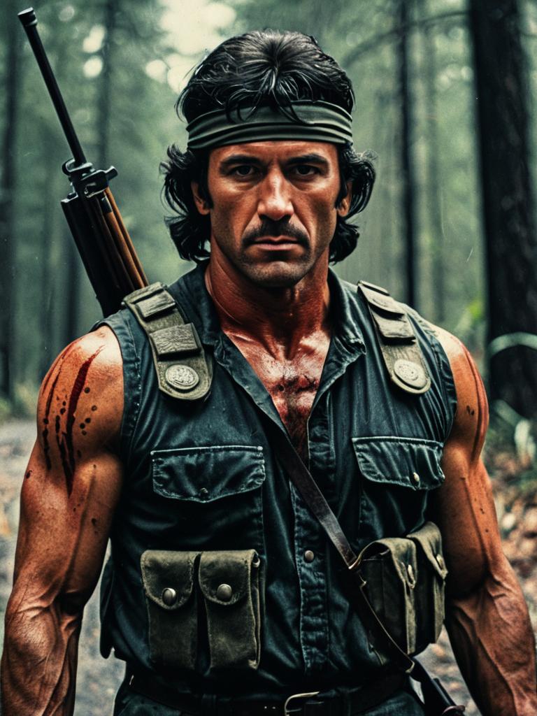 Photorealistic cinematic portrait of a muscular man wearing a Rambo First Blood costume. He has a green bandana, tactical vest, and black gloves. The man holds a rifle with a serious and intense expression. Background features a blurred forest setting, emphasizing gritty realism.