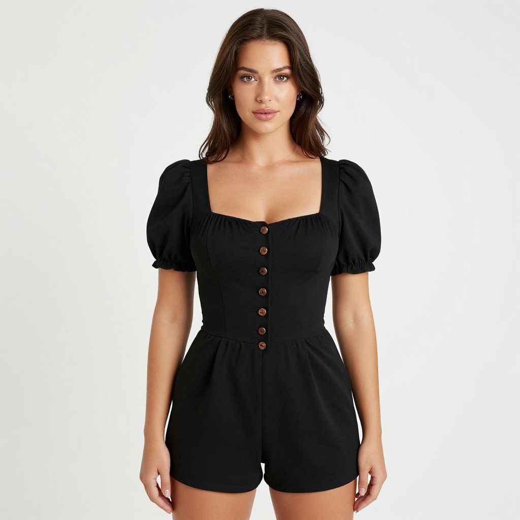 "Woman, retro-inspired, black romper with puff shoulders, square neckline, short puffed sleeves, front button closure with brown buttons, fitted waist, short length, plain white background.. Sexy. Pretty face and beаutiful eyes. Big breasts."
