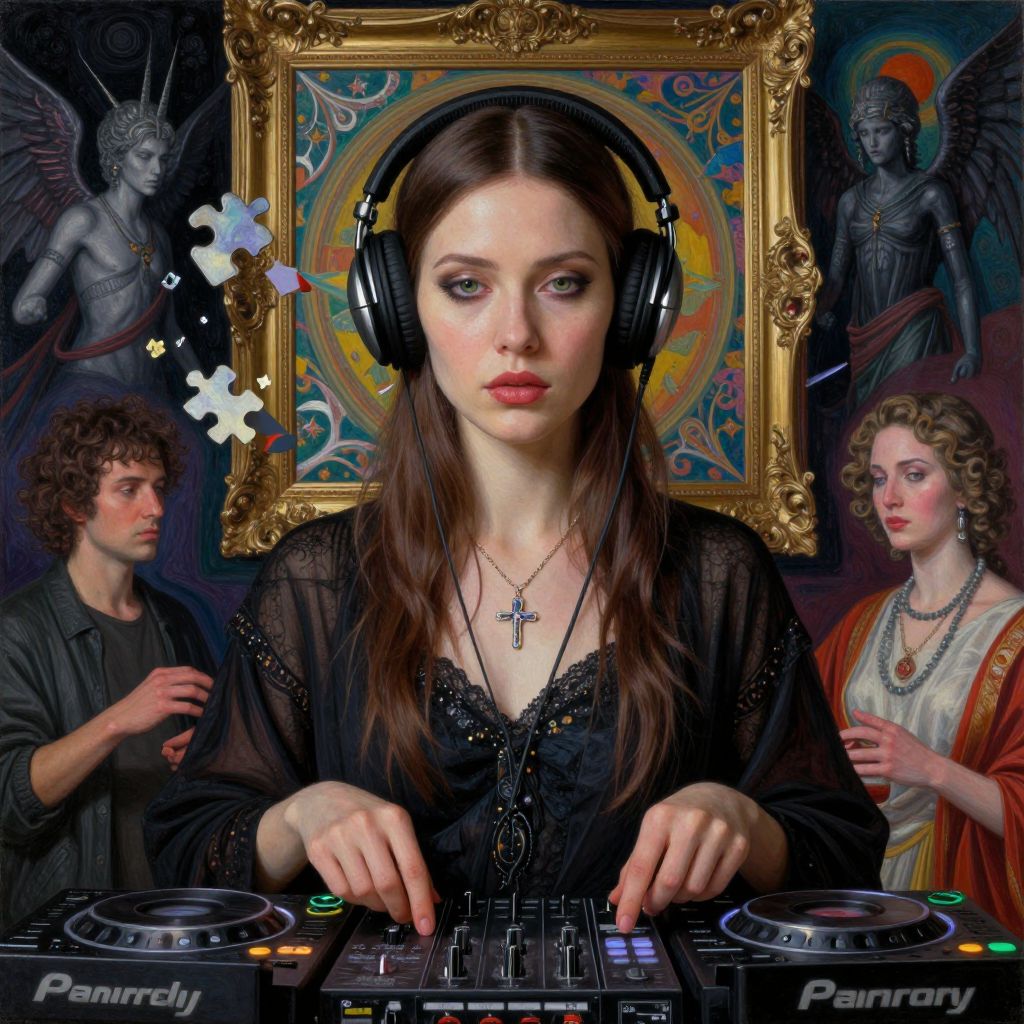 Digital artwork depicting a fair-skinned woman with long brown hair, wearing black headphones and a black lace top, mixing music on a Panracy DJ console. She has a cross necklace and a focused expression. Background features a golden framed, colorful, circular design and two winged angelic figures in dark, classical attire. A curly-haired woman in a red and white dress stands to her right, while a curly-haired man in black stands to her left. White puzzle pieces float near her head. The image combines elements of classical and modern styles.