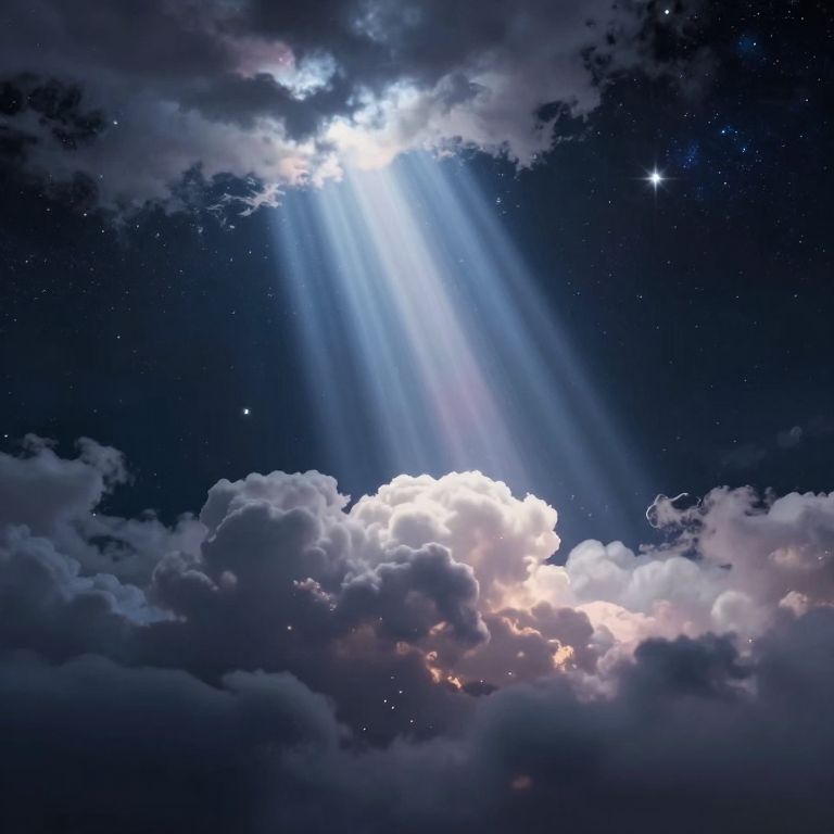 In a celestial symphony, beams of ethereal light pierce through the cosmic veil, cradling clouds in a dance of serenity and wonder, where the whispers of creation resonate with the promise of infinite possibility.