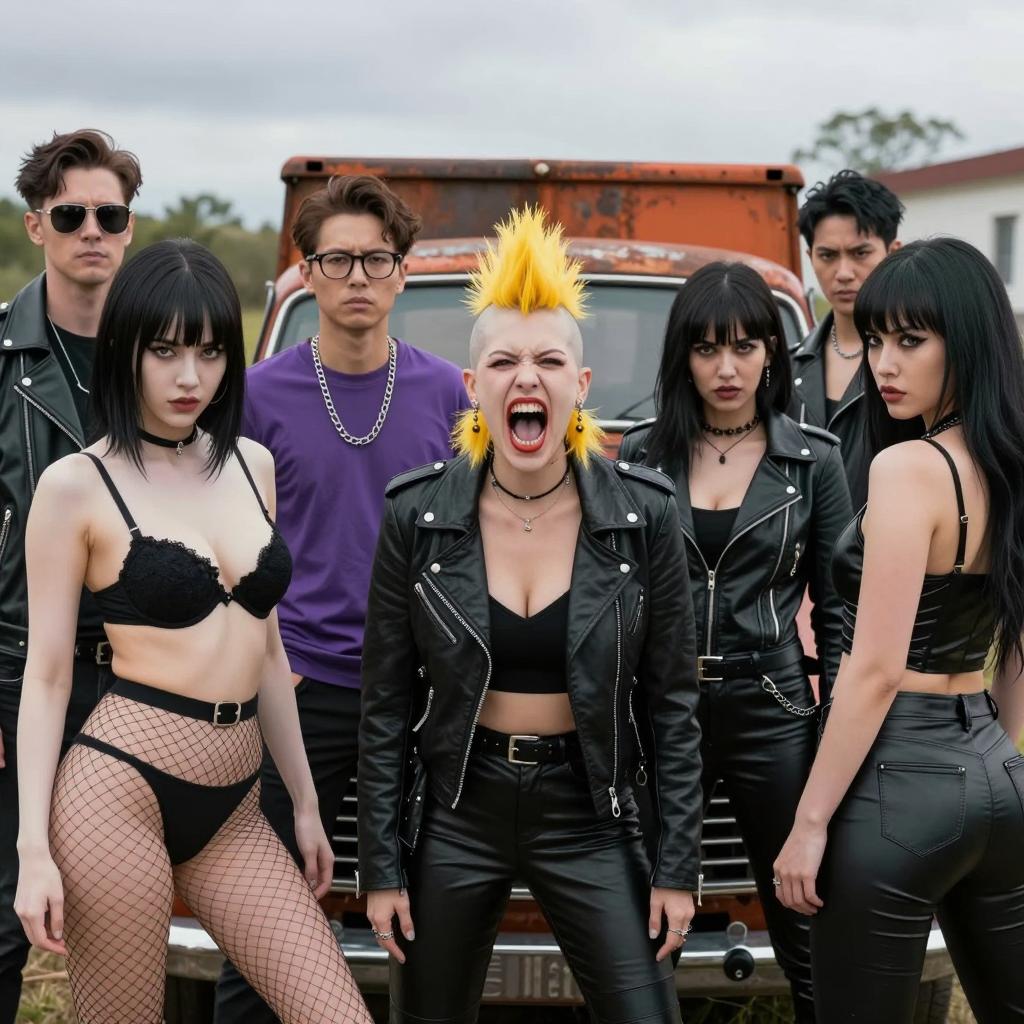 Darkly lit bathroom scene. Central figure in black trench coat and gas mask, standing with hands on hips. Four people in background: topless woman with medium breasts, shirtless man, another topless woman, and another shirtless man, all in dynamic, aggressive poses. White tiled walls, blue lighting, wet floor, red light reflections. Multiple outstretched arms in foreground. Film still style, intense expressions.
