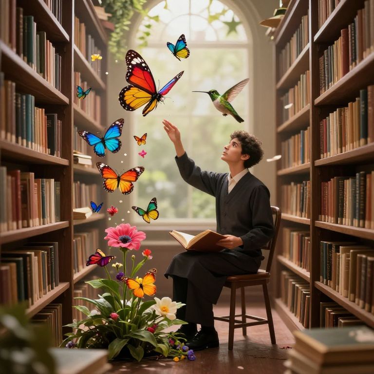 Photograph: Man in black shirt, seated in library, reaches for colorful butterflies, surrounded by books and vibrant flowers, with a hummingbird nearby.