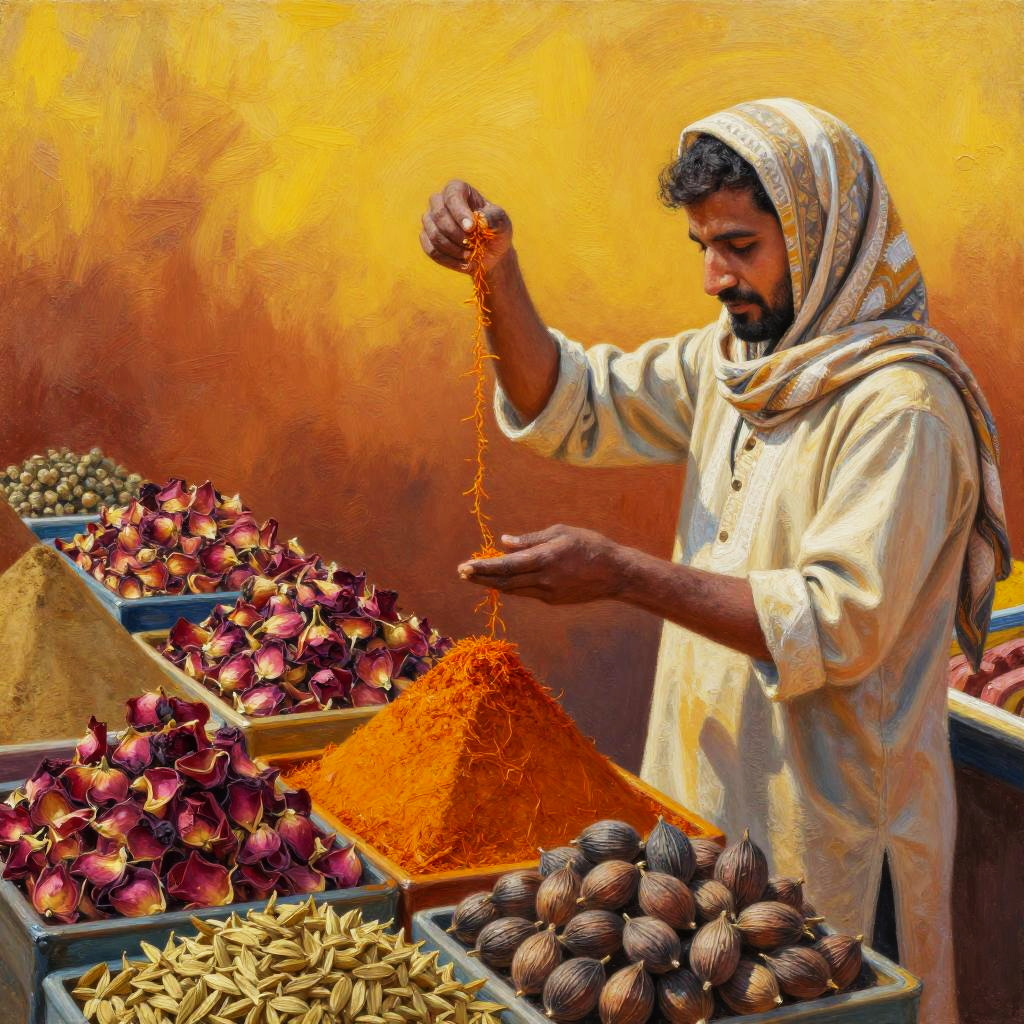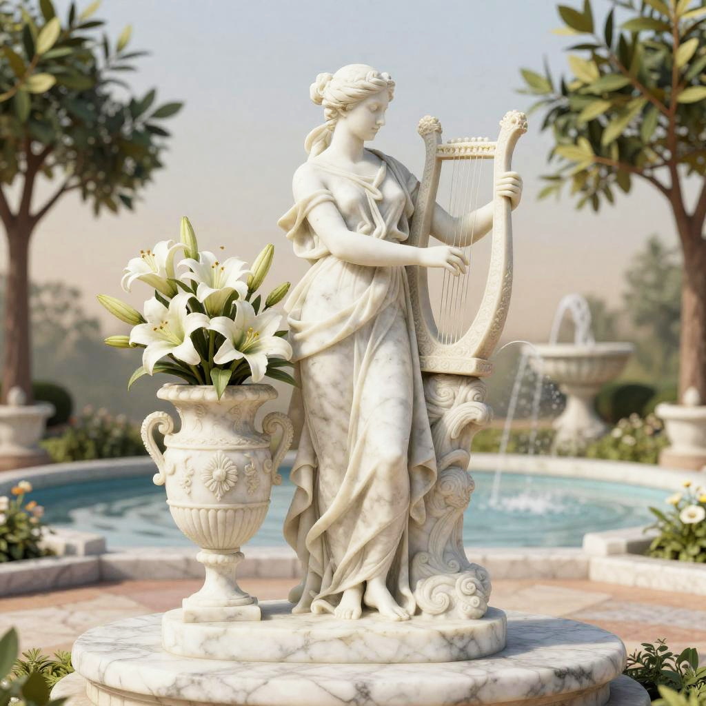 Baroque oil painting set in a lavish palace ballroom with chandeliers, depicting a nobleman in embroidered clothes holding a silver chalice next to a marble statue draped in ivy. The background falls from dark teal to light blue in a smooth gradient. Whimsical tone, refined composition, tactile detail, vibrant color, soft rim light, subtle texture, high detail, balanced layout.