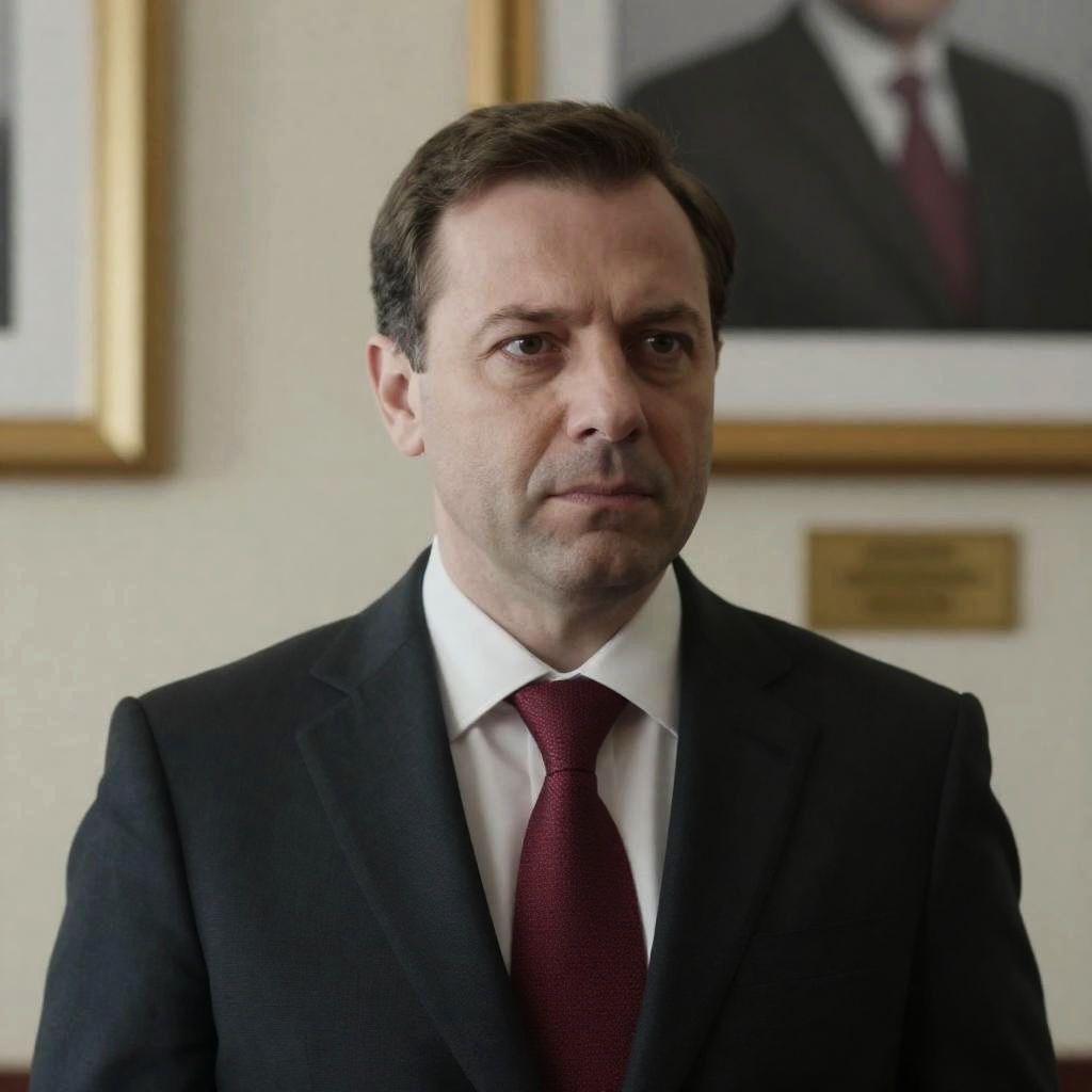 Photograph of a middle-aged man with dark, wavy hair, light skin, and a serious expression. He wears a dark blue suit, white shirt, and striped tie. Background shows a white, classical architectural structure. Man is centered, looking slightly to the right.