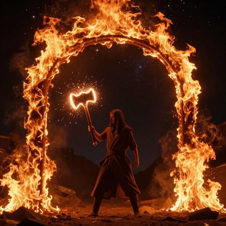 A lone figure stands at the threshold of a fiery archway, wielding a glowing hammer that shatters into brilliant sparks upon impact, as if forging celestial fire against the backdrop of a starlit night.