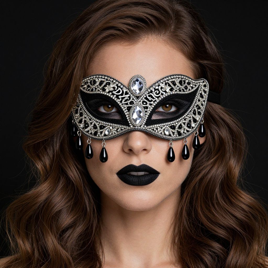 Elegant woman wearing a \"Demonica\" black and silver jewel half mask featuring intricate designs, dangling black teardrop accents, and a central diamond-like gem, complemented by bold black makeup and long, wavy brown hair.
