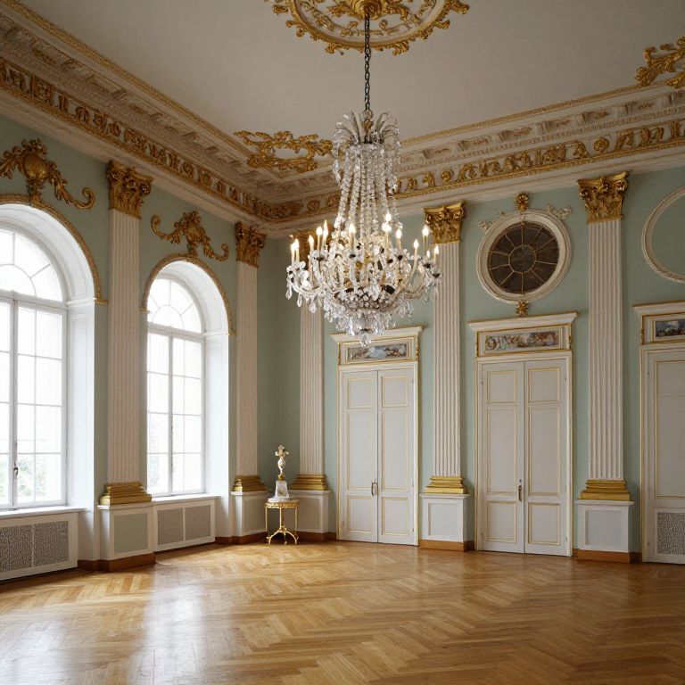 Photograph of an opulent, empty ballroom with elegant Rococo-style decor. The room features large, arched windows with white frames, allowing natural light to flood in. Ornate gold-accented columns and intricate moldings adorn the walls, which are painted a soft teal. A grand crystal chandelier hangs from the ceiling, reflecting light. The floor is made of polished parquet wood. Two white doors with gold trim and a round, decorative window are on the right wall. A small, golden pedestal with a decorative statue is positioned near the center. The room exudes luxury and historical elegance.