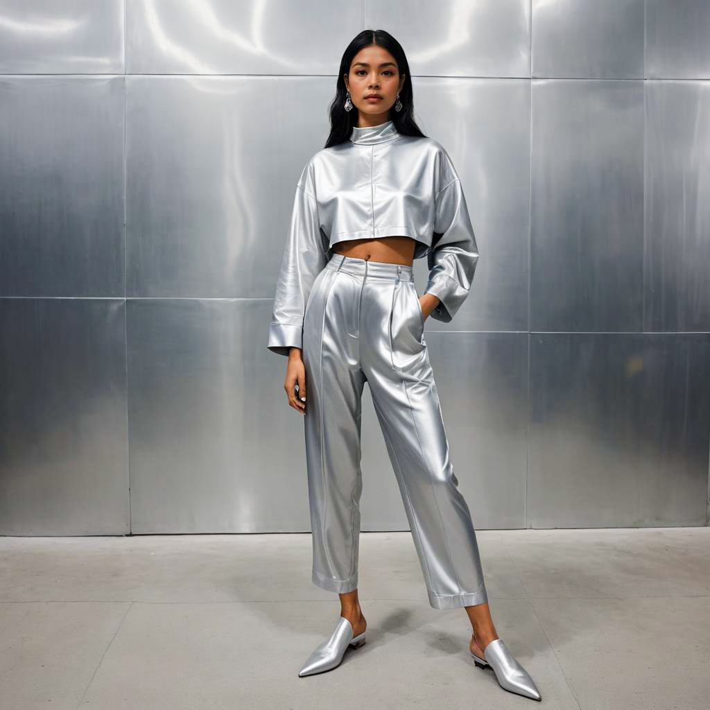 Portrait of a proportionate body Asian woman with long layered hair wearing a silver satin turtleneck crop top and matching tapered pants. She stands confidently against a metallic wall background in an urban setting, showcasing a modern and stylish outfit with silver high-heeled boots.