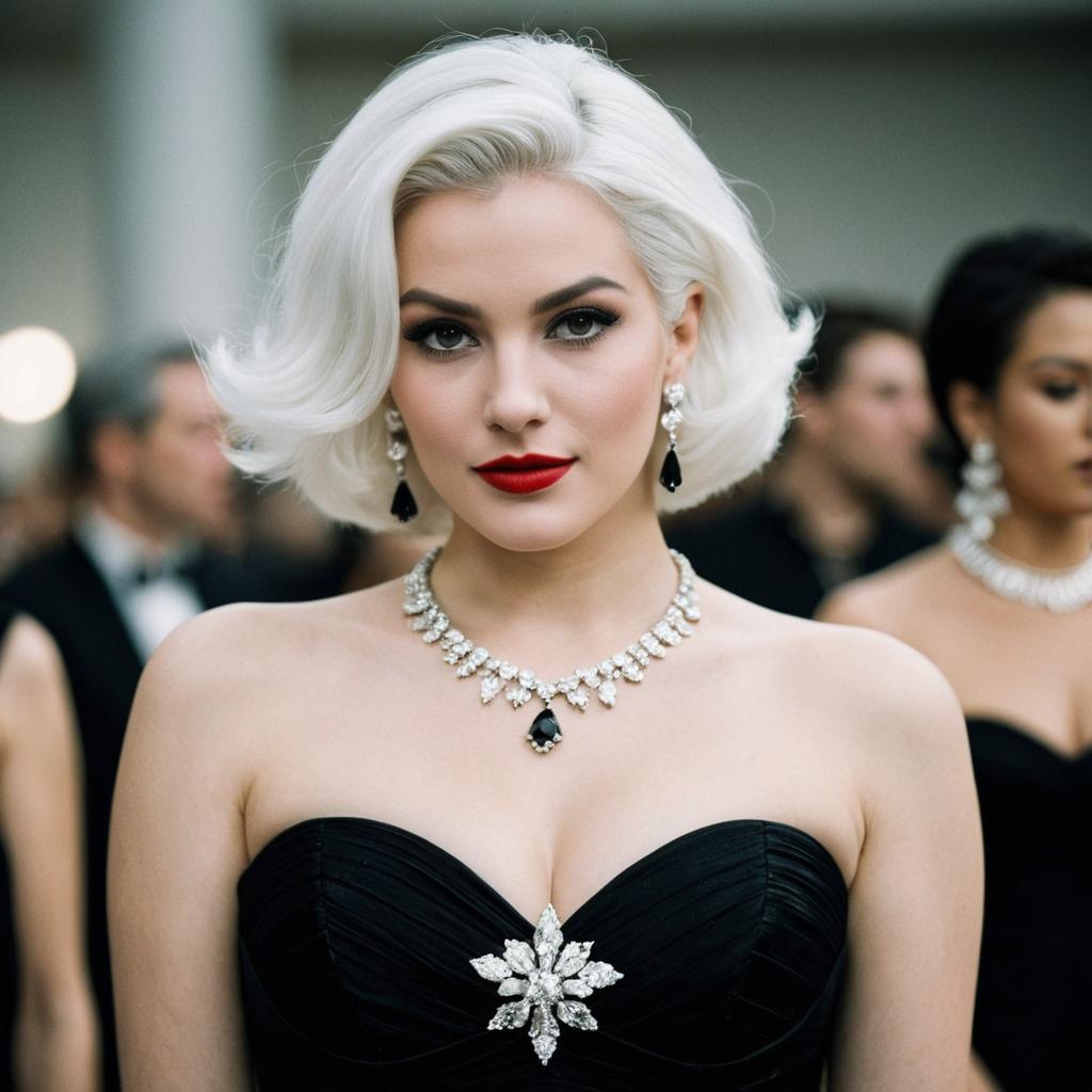 Gatsby attire costume,1girl, solo, blonde hair, jewelry, hands on own hips, dress, necklace, blue eyes, blurry, blurry background, short hair