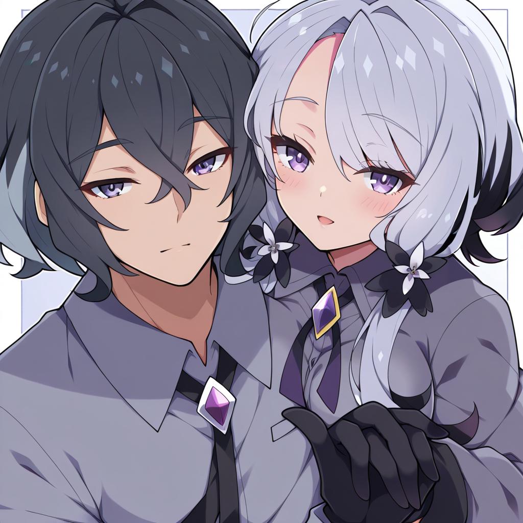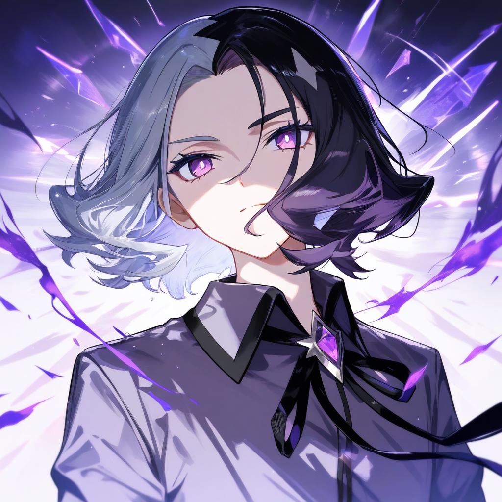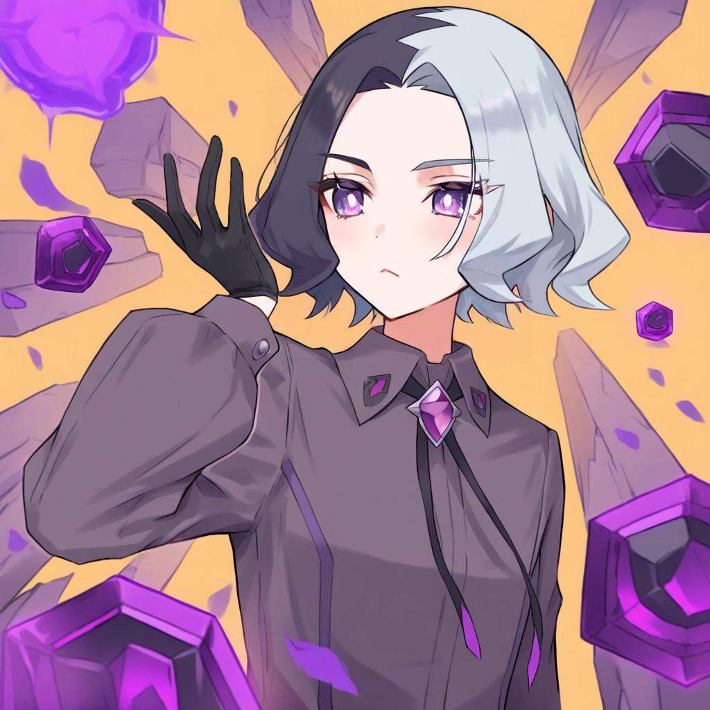 Amethio (pokemon), pokemon, 1boy, purple eyes, white pupils, symbol-shaped pupils, eyelashes, two-tone hair, short hair, black hair, grey hair, loose hair strand, collared shirt, grey shirt, black gloves, neck ribbon, long sleeves, purple gemstone, by artist senji (tegone spike), animagine