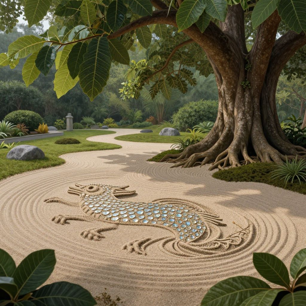 Digital painting of a serene Japanese garden with a curved sand raked path, tranquil pond, lily pads, rocks, and lush greenery.