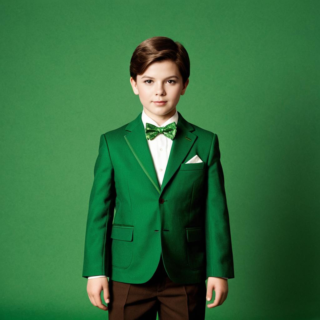 Patricks day costume,1boy, solo, male focus, formal, suit, belt, brown hair, bow, jacket, realistic, bowtie, pants, green jacket, looking at viewer, standing