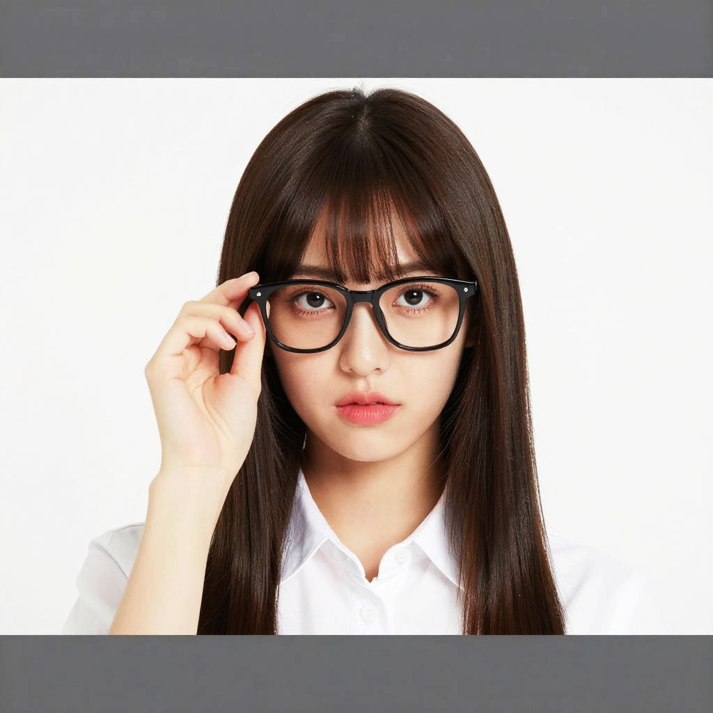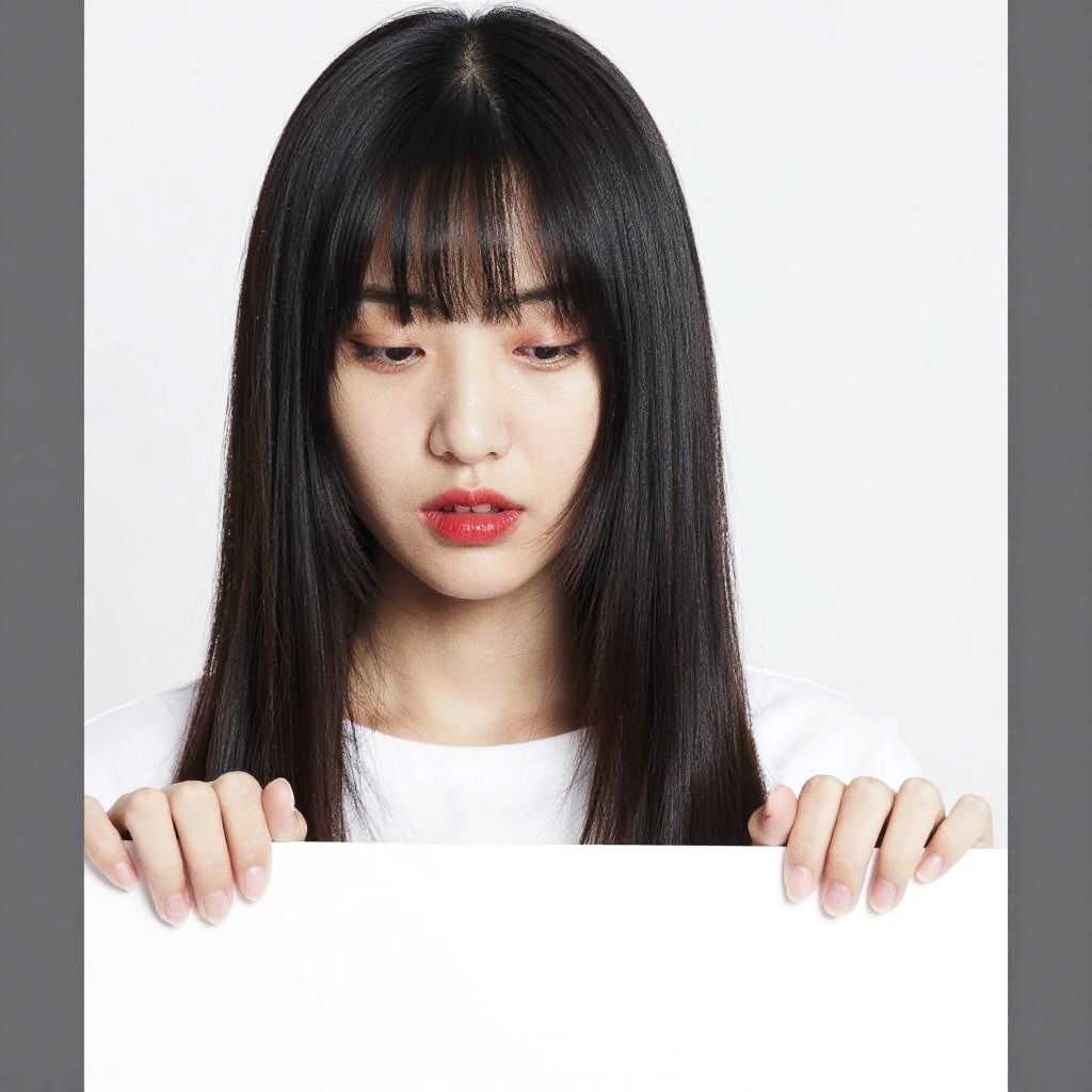 Photograph of a young woman with straight, black hair and bangs, gazing downward with slightly parted red lips. She has fair skin and is wearing a white top. Her hands are resting on the top edge of a white horizontal strip in the foreground. The background is a solid white, creating a high contrast with the gray borders on the left and right.