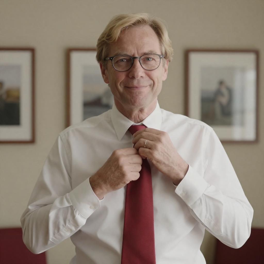 Photograph of a middle-aged man with blonde hair, wearing glasses, and a white dress shirt, adjusting his red tie. He has a slight smile and is standing in a room with framed pictures on the wall. Background includes a beige ured wall and part of a red chair.