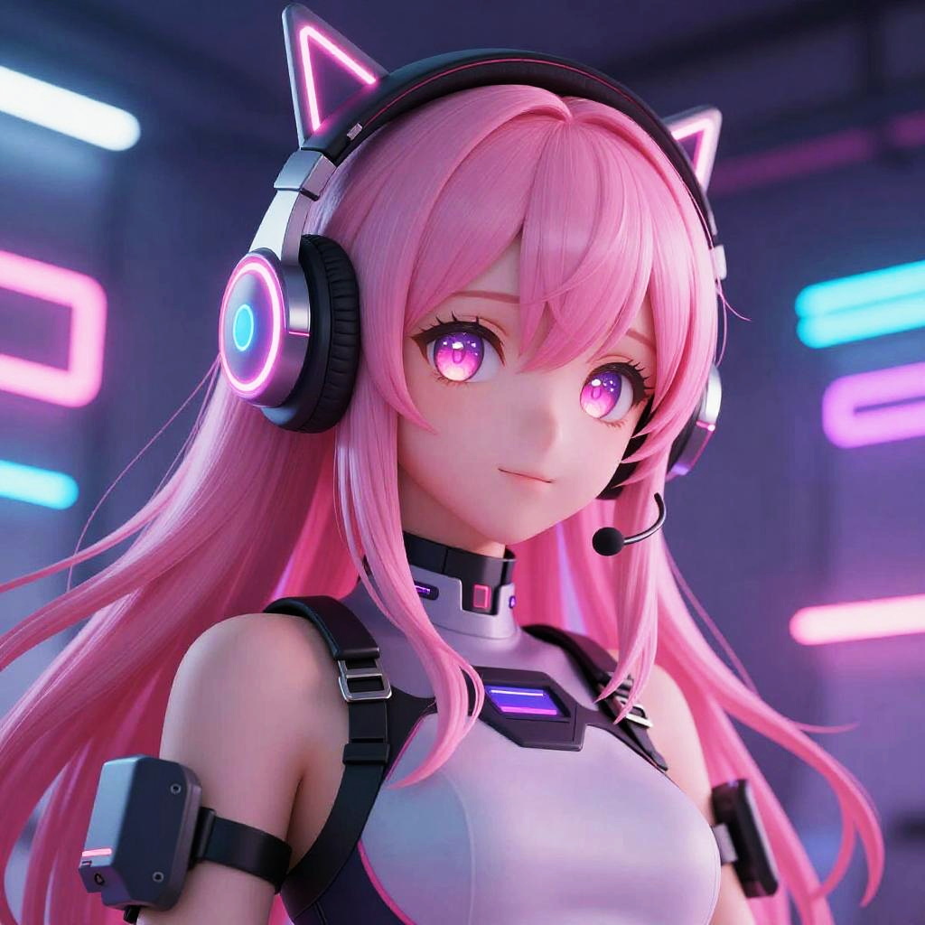 Anime girl with purple hair and blue eyes in a futuristic cyberpunk setting, neon lights reflecting on her sleek outfit, holding a holographic device, intense expression, intricate mechanical details, vibrant mix of blues and purples, high contrast