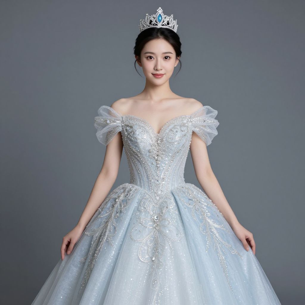 Princess Crown Dress, a woman in a blue gown and crown poses for a photo