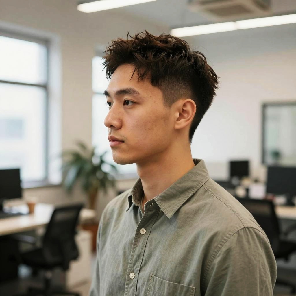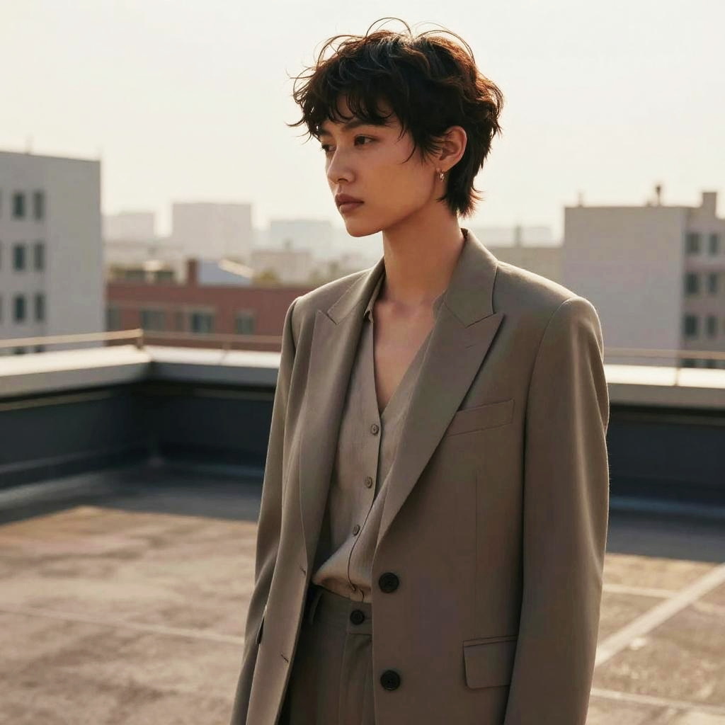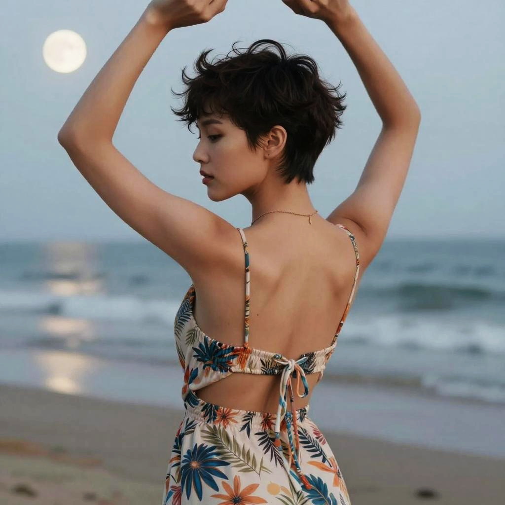Wavy Faux Hawk hairstyle on female dancer, wearing summer dress, in beach, captured in fashion editorial style with soft moonlight.
