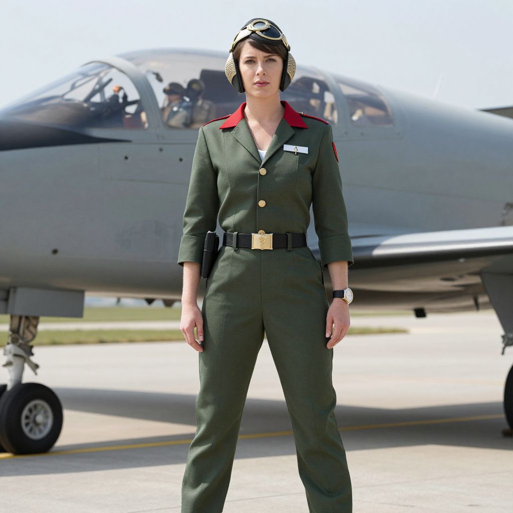Photograph of a confident woman in a green military flight suit with red collar, black headgear, standing in front of a grey military jet on a