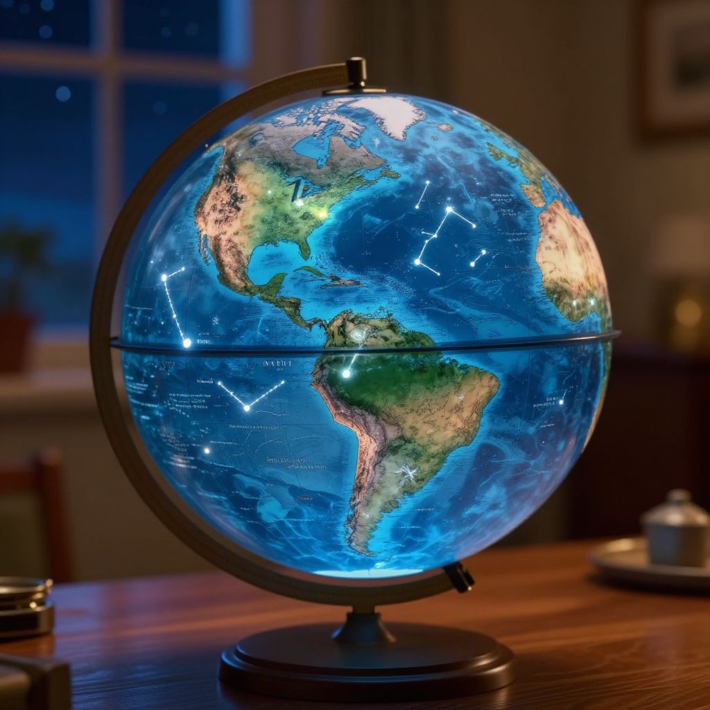 A close-up digital art representation of an antique globe on a wooden desk featuring North and South America. The globe includes glowing constellations and magical landscape details, illuminated with a soft blue hue. The scene is set in a cozy room with warm lighting and a window showing a starry night sky, rendered in hyper-realistic 8k resolution inspired by the styles of Hayao Miyazaki and Greg Rutkowski.