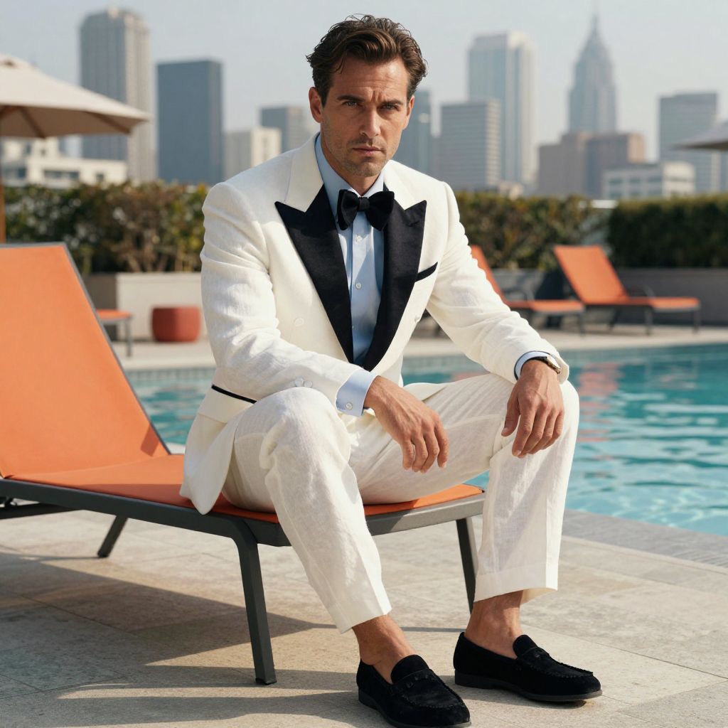 A man, white linen suit, black velvet lapels, light blue dress shirt, black bow tie, black suede loafers, sun-drenched rooftop pool, city skyline backdrop, vibrant lounge chairs, cinematic film style, confident expression. Man has masculine face and piercing eyes