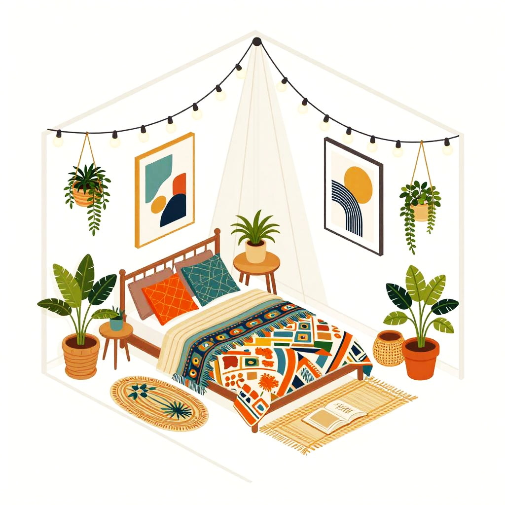 Isometric bedroom drawing capturing a vibrant bohemian-style room filled with colorful textiles, a canopy bed, eclectic furniture, hanging plants, abstract wall art, and soft ambient string lights creating a relaxed, artistic atmosphere.