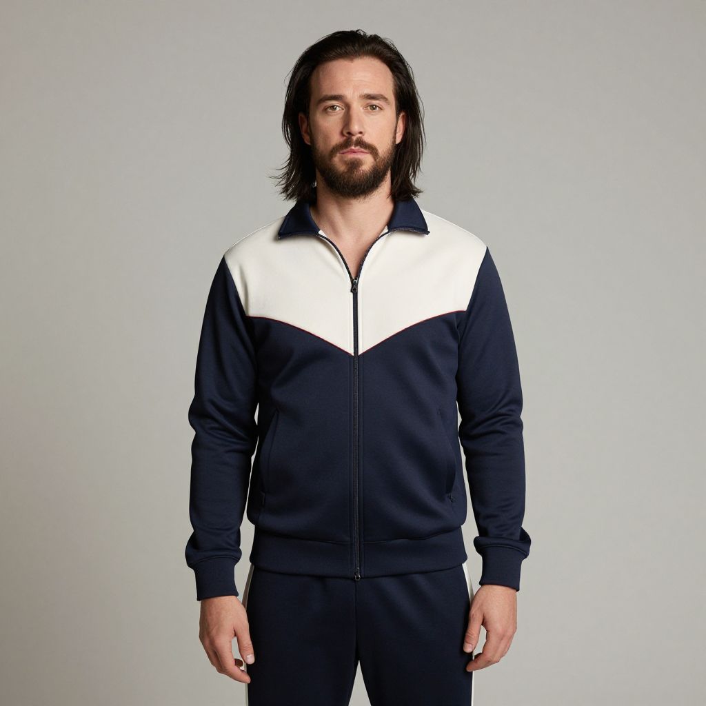 Ted lasso track suit costume, solo, 1boy, male focus, long hair, facial hair, black hair, jacket, beard, simple background, looking at viewer
