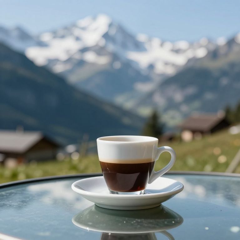 Picture of a small espresso coffee cup standing on a glass table outdoors. beautiful swiss mountains are in the background. high quality 4 k photo, bokeh, background blur, detailed, sharp