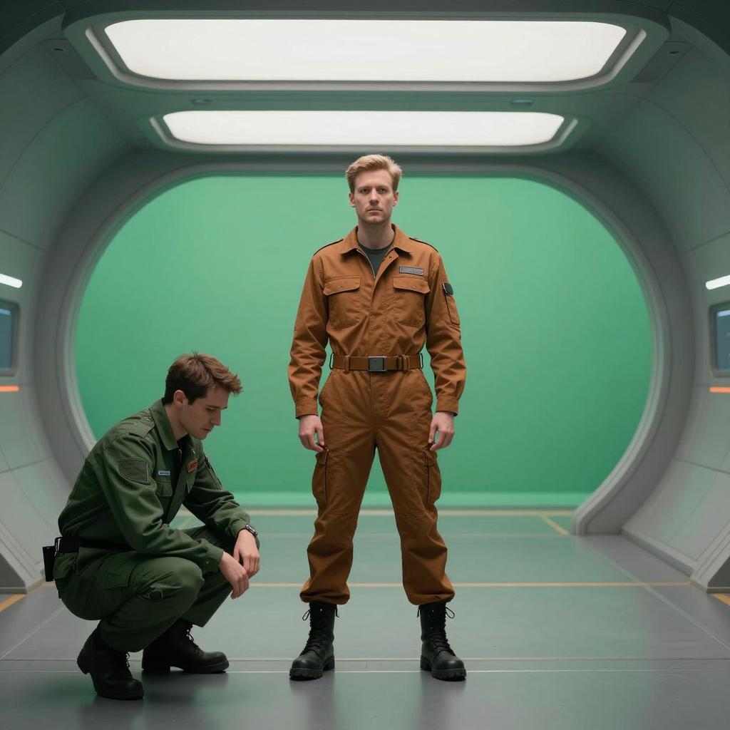 Two men in a futuristic, tiled room with circular walls and green lighting. One man, squatting on the left, wears a dark green uniform and looks down. The other, standing in the center, wears a brown jumpsuit and looks forward. Green screen in the background. Bright overhead lights.