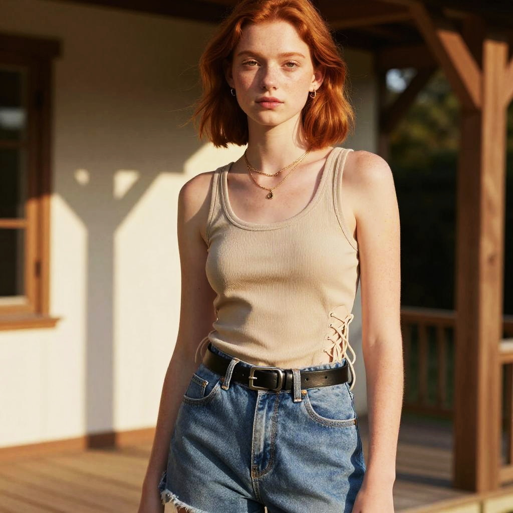 Portrait of a young woman with shoulder-length chestnut hair and light freckles, casual chic in a soft white linen blouse with rolled sleeves and delicate embroidery, lace-up side detail tied at the hem, olive green cargo pants, braided brown leather belt with antique brass buckle, layered silver necklaces, simple daytime makeup, set in quiet urban rooftop with city skyline, lit with soft late afternoon natural light, editorial fashion photography vibe, shallow depth of field, soft shadows, high detail, balanced composition, photorealistic, SDXL, clean background