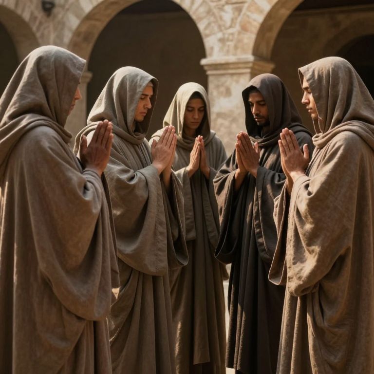 Photograph of six solemn individuals, likely monks or nuns, standing in a circle and praying with hands clasped. They wear loose, beige, hooded robes with long sleeves. The background features an arched stone structure with a textured, aged appearance. The lighting is soft, casting gentle shadows, emphasizing the contemplative and reverent atmosphere. The individuals have serious expressions, and their robes have a slightly worn, rough texture. The image captures a moment of quiet devotion in a historical or medieval-style setting.