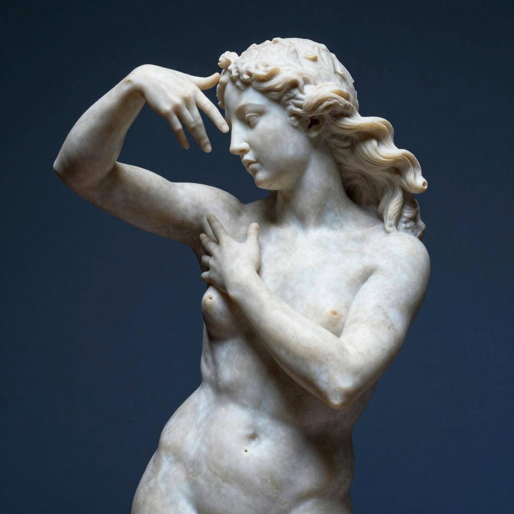 Realistic photo.marble sculpture of a woman with long hair and polished surface, dynamic action, defined facial features, surrealist sculpture, blue background, concrete art, atmospheric and introspective mood that conveys emotion in its imperfections, ultra-detailed, high quality with striking textures and depth, ideal for an impressive display of artistry. realistic photo