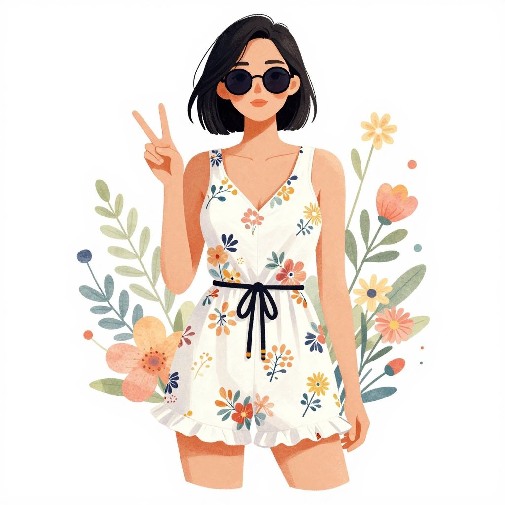 Illustration of a young woman with short black hair wearing dark round sunglasses, a white sleeveless romper featuring multicolored floral prints. The outfit has a V-neckline, cinched waist with a black drawstring, and a frilled hem, ending above the knee. The background is white with decorative floral elements surrounding her. The woman is posing with a peace sign, embodying a casual summer style.