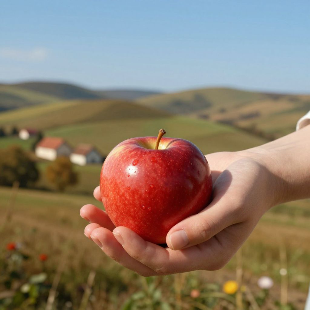 A photograph captures a close-up of a fair-skinned hand holding a shiny, red apple with subtle yellow speckles. The hand is positioned in the foreground, slightly to the right. The person wears a dark, textured, woolen jacket. In the background, a sunlit, rolling countryside with green hills, a few scattered trees, and a distant farmhouse with a red roof is visible. The sky is clear and blue, enhancing the vibrant colors of the apple and the landscape. The image has a slightly exaggerated, almost hyper-realistic quality.
