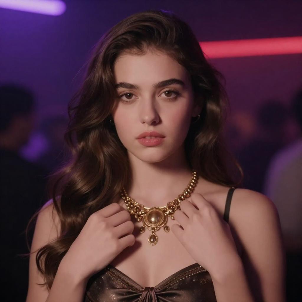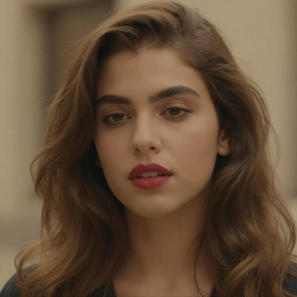 Photograph of a young woman with wavy, light brown hair and olive skin, looking slightly to the side with a neutral expression. She has full lips with red lipstick, dark eyebrows, and subtle makeup. The background is softly blurred with warm, golden tones. Her hair appears slightly tousled, adding a natural, casual look.
