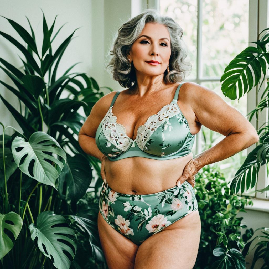 Image in the style of Impressionist Garden Greens, peaceful older woman, silver loose waves, curvy mature figure, lingerie cut-out set, floral silk bralette, pastel high-waist briefs, lush indoor plants