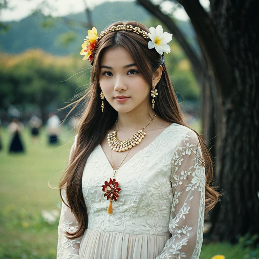Miu iruma costume,1girl, solo, jewelry, long hair, necklace, hair ornament, blurry background, earrings, dress, brown hair, looking at viewer, flower, hair flower, blurry, outdoors, tree, realistic, long sleeves