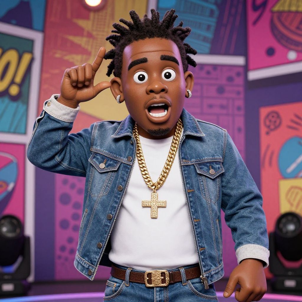 Digital cartoon of a tattooed, black-haired boy with spiked hair, wearing a black T-shirt, chain necklace, and earring, standing against colorful