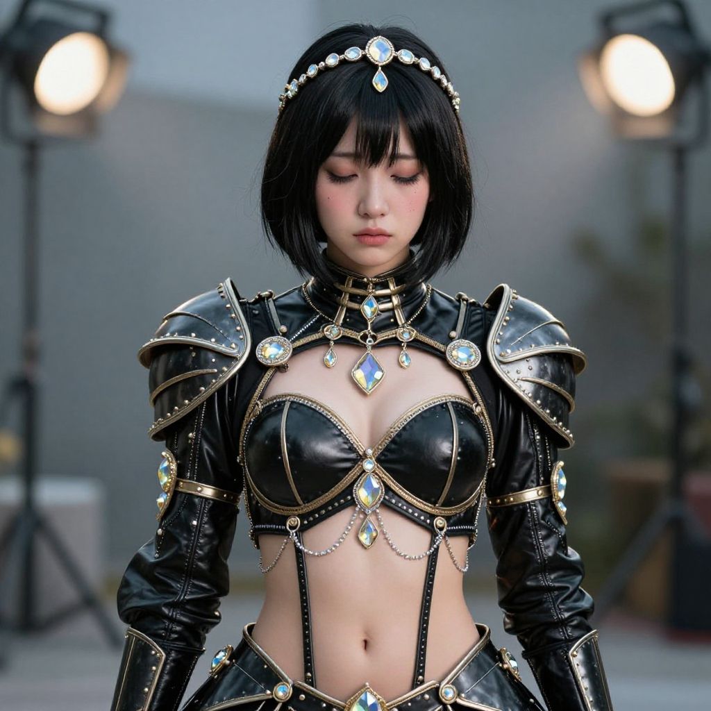 Digital art of an Asian woman with black bob haircut, wearing revealing black leather and silver armor with gemstone accents, standing in front of studio lights.